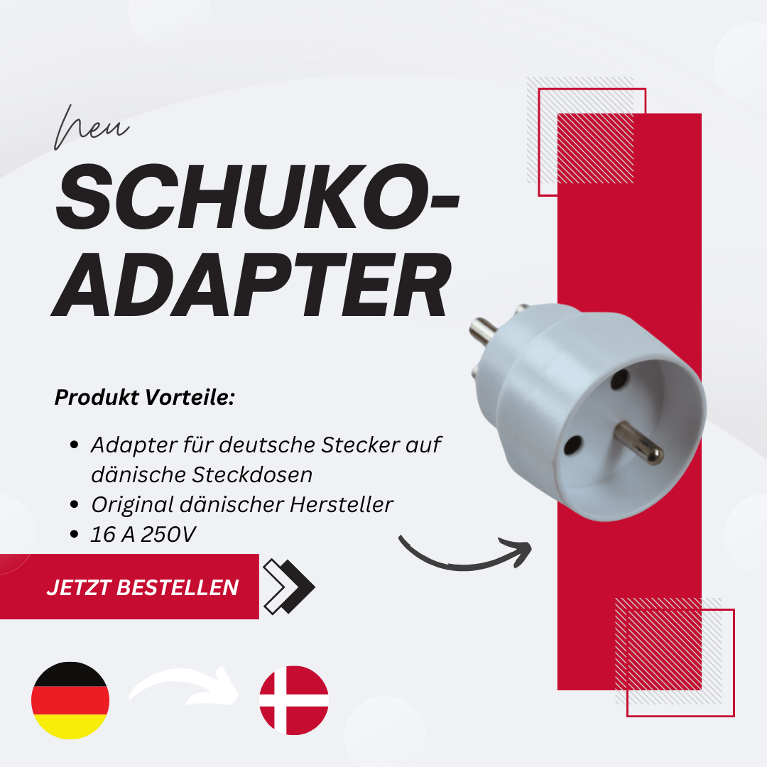 Wir bieten Schuko-Adapter (“deutsche Stecker auf dänische Steckdosen”) für nur 7,49 Euro zzgl. Versandkosten. Ab 10 Stück Mengenrabatt. (Stand 15.05.24)